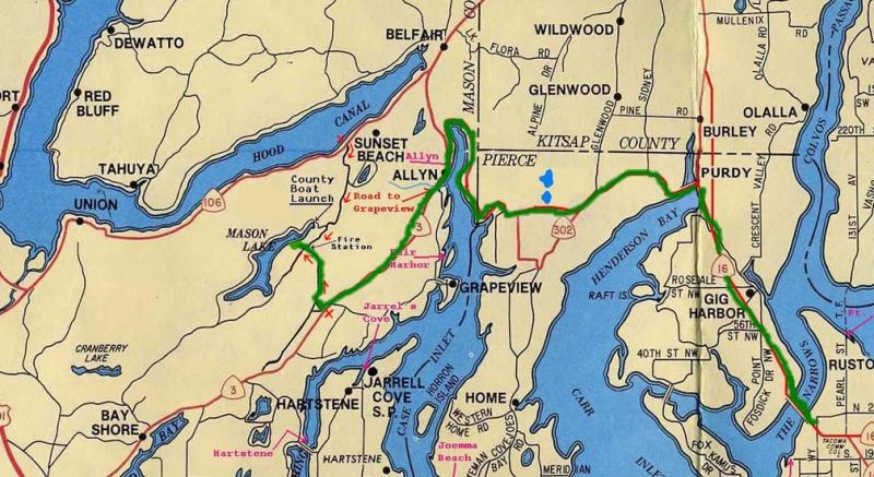 Mason Lake is southwest of Bremerton, and 11 miles (21 minutes according to Google Maps) from the town of Allyn. If you can get yourself to Allyn by various routes, just head south from there on Highway 3 for 6.7 miles, turn right on East Mason-Benson Road, then go about 4.4 miles up and over the hill and down to the shore of Mason Lake. (When you get to the intersection where you'll see the volunteer fire station, go straight ahead through the four-way stop; not much farther down the hill you'll come to another stop sign: the entrance to Sunny Slope Park is virtually straight ahead across the intersection.)
