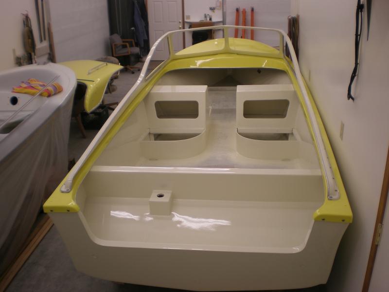 Hello Bob, the hull was sprayed with Nason Fulthane, A 2 part urethane. The color is Wimbledon White a color that Ford used for many years in the 60's and 70's. I agree the off white really sets off that yellow! Dave won't be sneaking anywhere in that BellBoy.