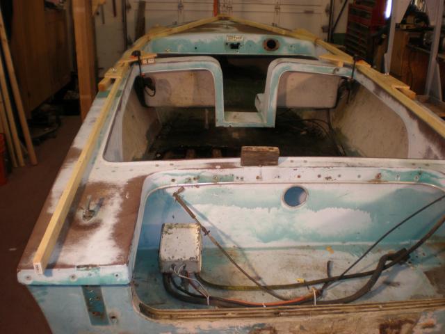 After removing the rub rail and some assorted hardware I started to lift the upper deck, with the moulded in seats it wanted to fold up in the middle, so I built a frame work out of 2x2 and 1x2'' to support the deck. Worked out pretty good. One experiment after the other!