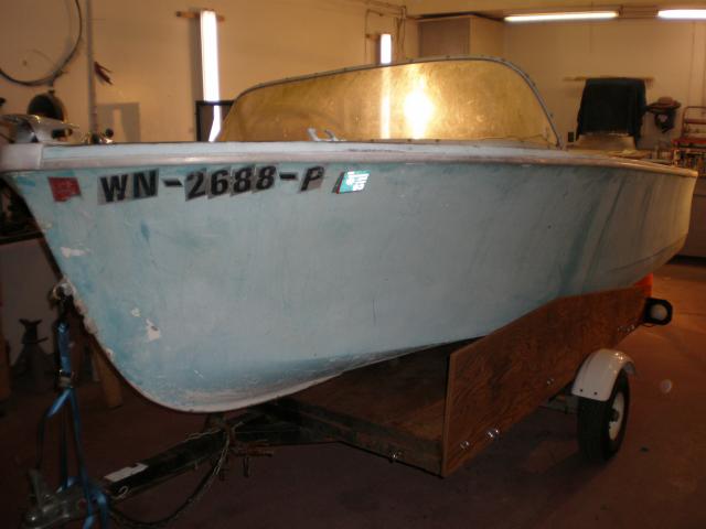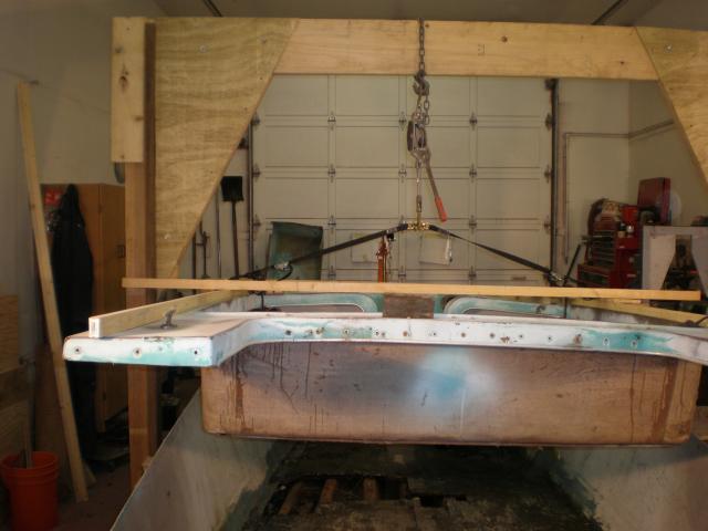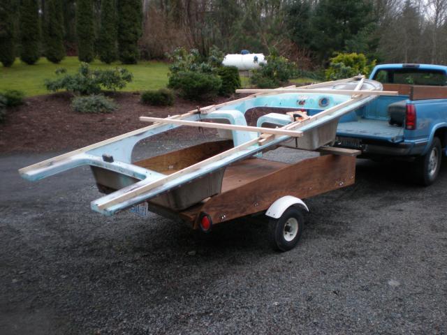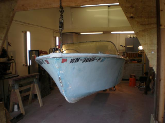Thought I might post a few shots of my latest project. 1964 Wright Sportsman, built in Bellingham Wa. My Inspector said it's time! I got it loaded on my utility trailer and in the shop. Keep in mind I'm working alone so I built a gantry and use an engine hoist to manover the boat around. I also built a cart to roll around in the shop as this boat came without a proper trailer.