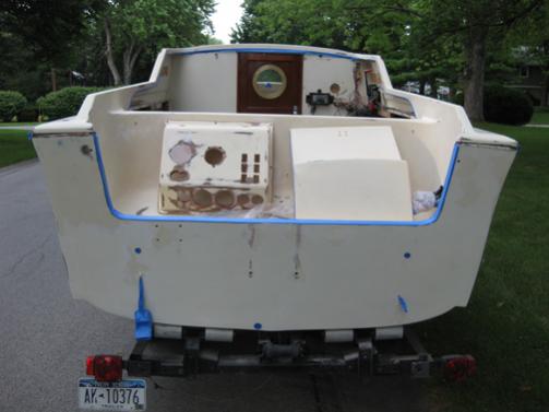 The boat has been completely sanded smooth with 80 grit followed by 220 on the orbital sander. I wiped everything down with Interlux Solvent 202 and then masked off the entire hull. I decided to paint the whole boat down to the water line. The rub rail and side trim piece are just too difficult to remove without removing the cabinet structures inside. I hope it will be an acceptable finish with them attached. The old gelcoat is very smooth. Tomorrow I will roll and tip the first coat of Interlux 404 Primer...