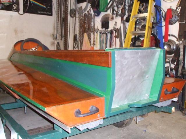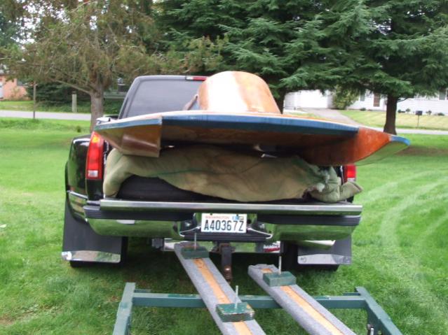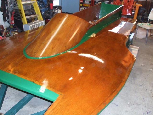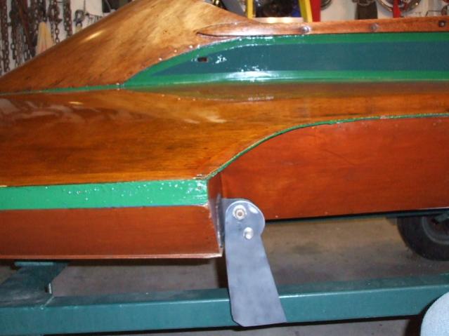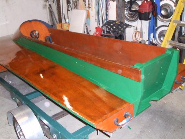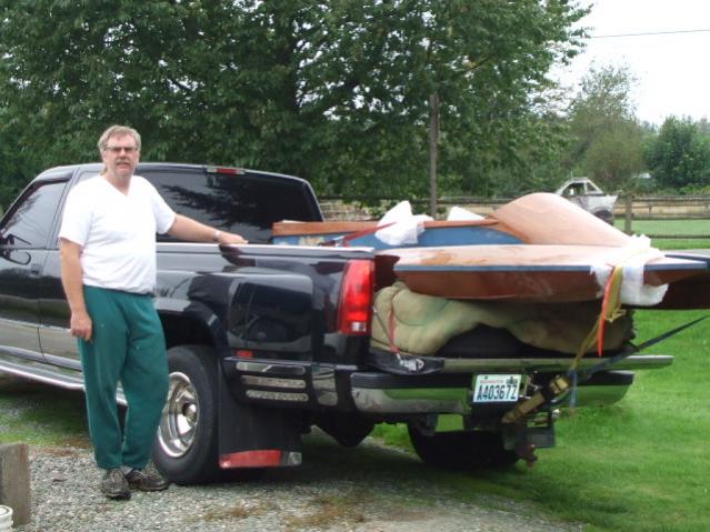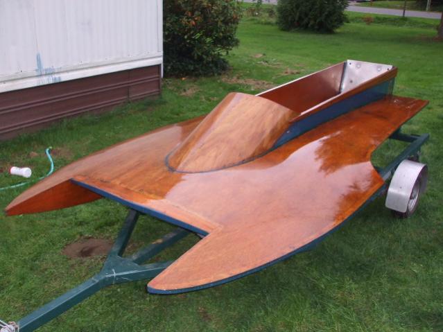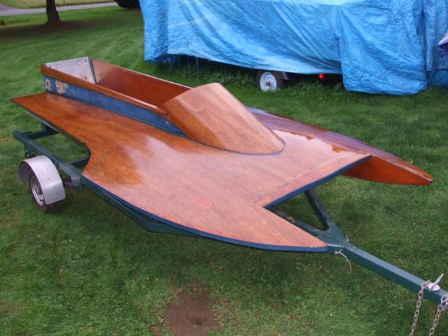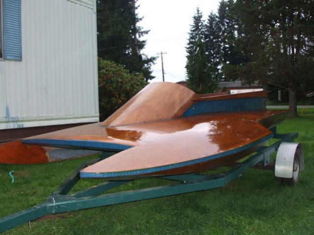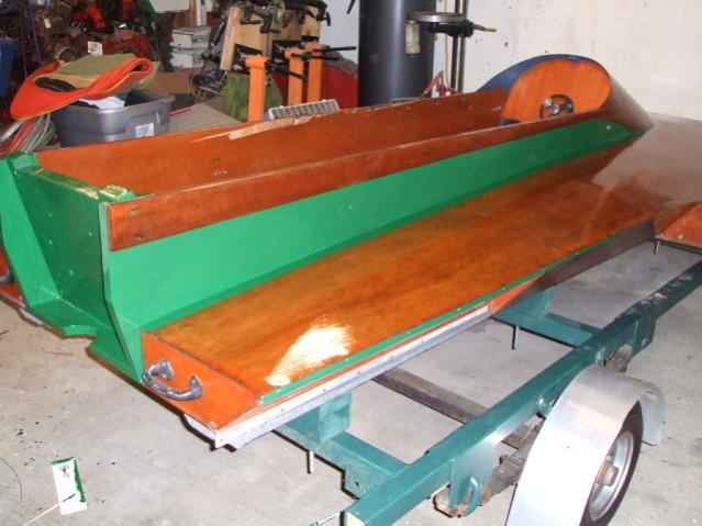 ) but we were tired, and having a hydro poking out the back of the truck was going to make parking a challenge. It was 9:00 when we got home, 12 hours and about 500 miles later!:Bigdriving1: We spent Sunday hanging another hydro up in the shed (to free up the trailer) and modifying the trailer to fit this boat. Then mating the 2 together. I am very happy with the look of this boat. It is an older (read heavier) hull but is really solid with a nice fresh varnish job. I already have the engine for it so it's basically a rigging affair. I'm really not much of a wood boat guy, but I couldn't say no to such a pretty little thing!