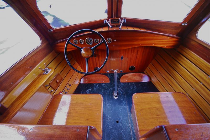 The restoration amounted to building a new 1936 Lylecraft. We saved most of the original side frames and some mahogany from the cabinsides, but otherwise everything you see is new construction--the bottom, side planks, cabintop, interior, hardware, gauges, steering and all running gear. The old flathead V-8 was totally rebuilt and, in the process boosted from 85hp to 160hp, thanks to Dick Gabrielson of Dick's Lakeside Flathead.