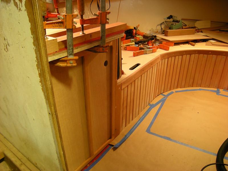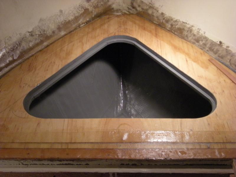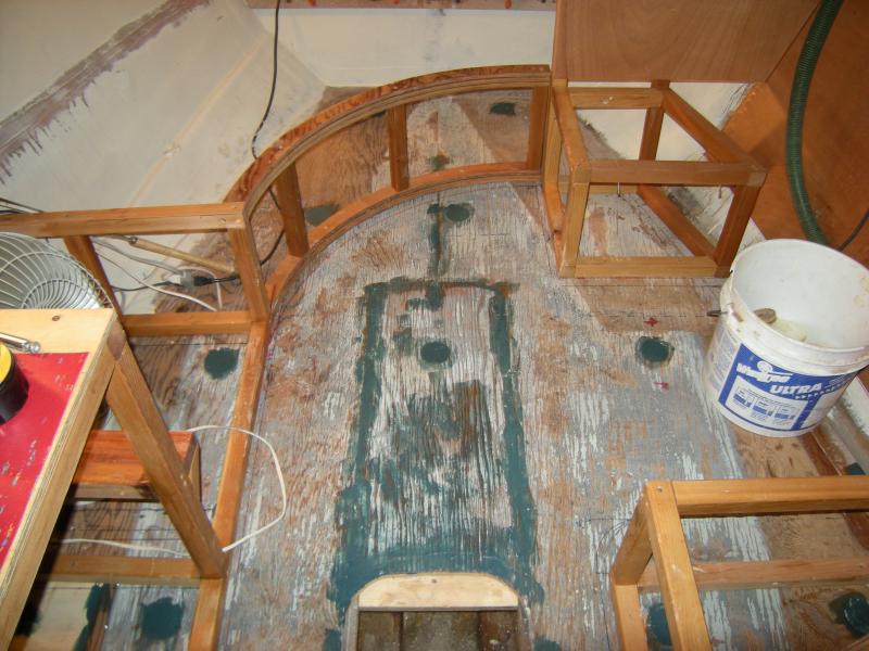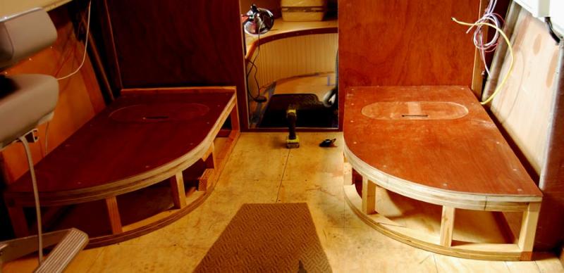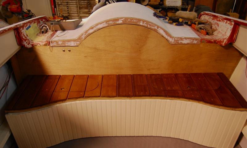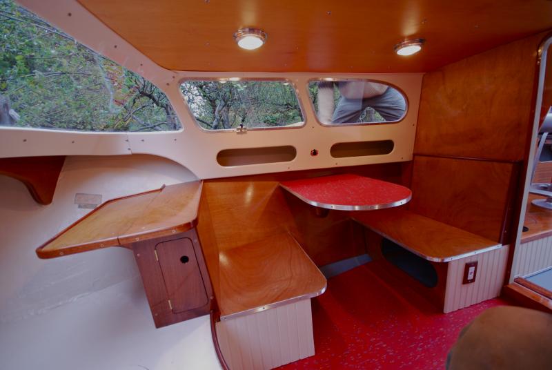 The cabin's interior ceiling is 1/4-inch maple paneling, stained a golden color to contrast with the darker mahogany trim. To starboard is a dinette table with bench seats; to port a sink with stainless bowl and porta-potty hidden under a hinged lid. The forepeak berth is asymetrical--really more like a curving chaise lounge than a typical berth. (Bruce will have cushions made to cover the berth and perhaps also the stern bench seat.) There are storage cubbies everywhere, it seems, including under the forepeak berth, beneath the dinette seats, under the galley sink, forward of the dinette, under the cockpit seat risers, and inside the cockpit's mahogany side panels.