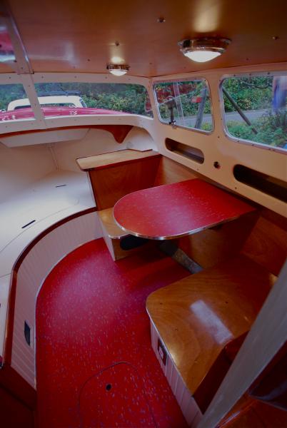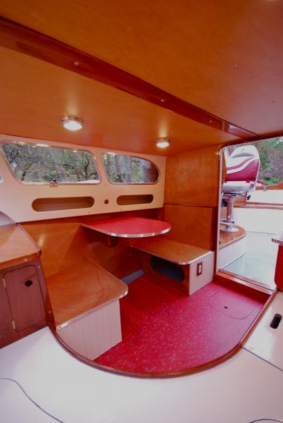 Bruce chose a new Suzuki 140-hp four-stroke for power. The boat has a single fuel tank under the cockpit's aft bench seat; curved risers to support the two swivel seats; and a fresh interior that is somewhat reminiscent of a '50's diner, with red Marmoleum on the floor and countertops, scalloped aluminum trim, wainscoting on the sides of seats and bunks, and mahogany everywhere else.