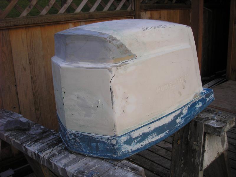 Still working on my 17ft Skagit but I have the Bearcat shroud finished and ready to complete the engine. I will post some progress pictures of the boat which was just finished painting. Now the fun part starts , putting it back together. I put some heat on the front top Homelight emblem and with a painters tool It came off pretty easy. I put some heat on the back emblem and it fell right off. 12 fT. rule is in effect !