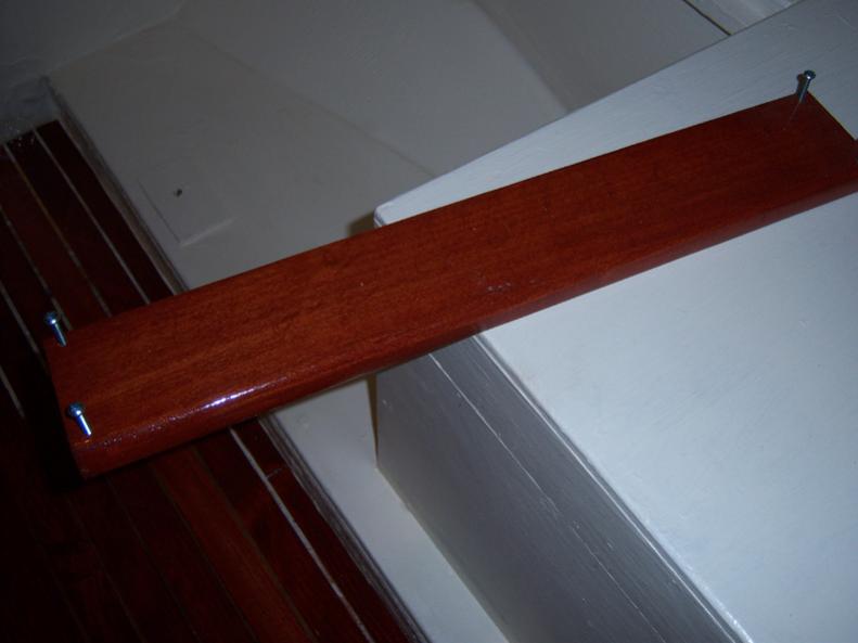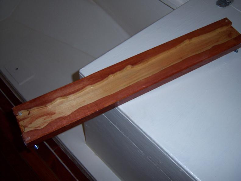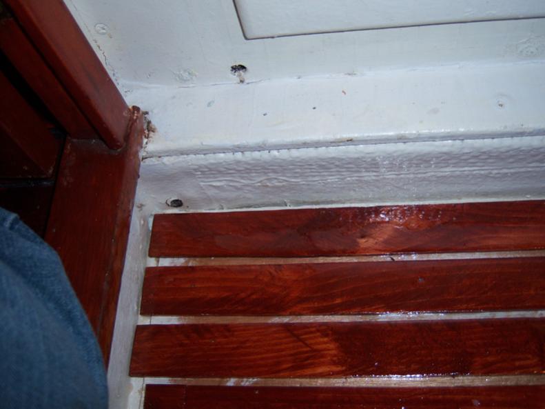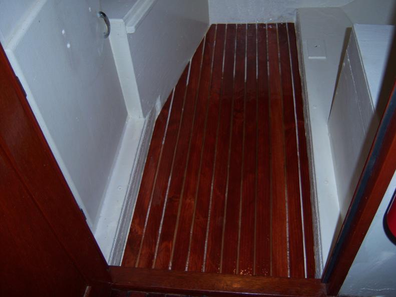 Also shown is the rear of the floor by the bulkhead to show where I plan to drill through the stringer to pass the wiring. The routed out molding will hide the wires and the uneven strips of mahogany. I will cut access hols in the head box floor and cabinet florr so that when the wires are in place, I will be able to seal the hole in the stringer from both sides with 3m 5200. That should keep the water from leaching into the stringer and causing rot.