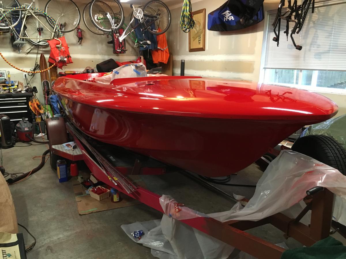 I have chosen Interlux Brightside enamel, as the color matches almost perfectly to what is already there. Therefore I am using Interlux Pre-Kote primer to smooth out my amature fiberglass work... So far even with only one coat of primer I am shocked at how smooth everything has turned out! I will still be doing at least three coats of primer, with stepped sanding between, ultimately getting to 400 grit before I start the top coats... Then I will be doing, hopefully, 4 coats of "Fire Red" finished with 2000 grit and then polishing the entire boat to even out.