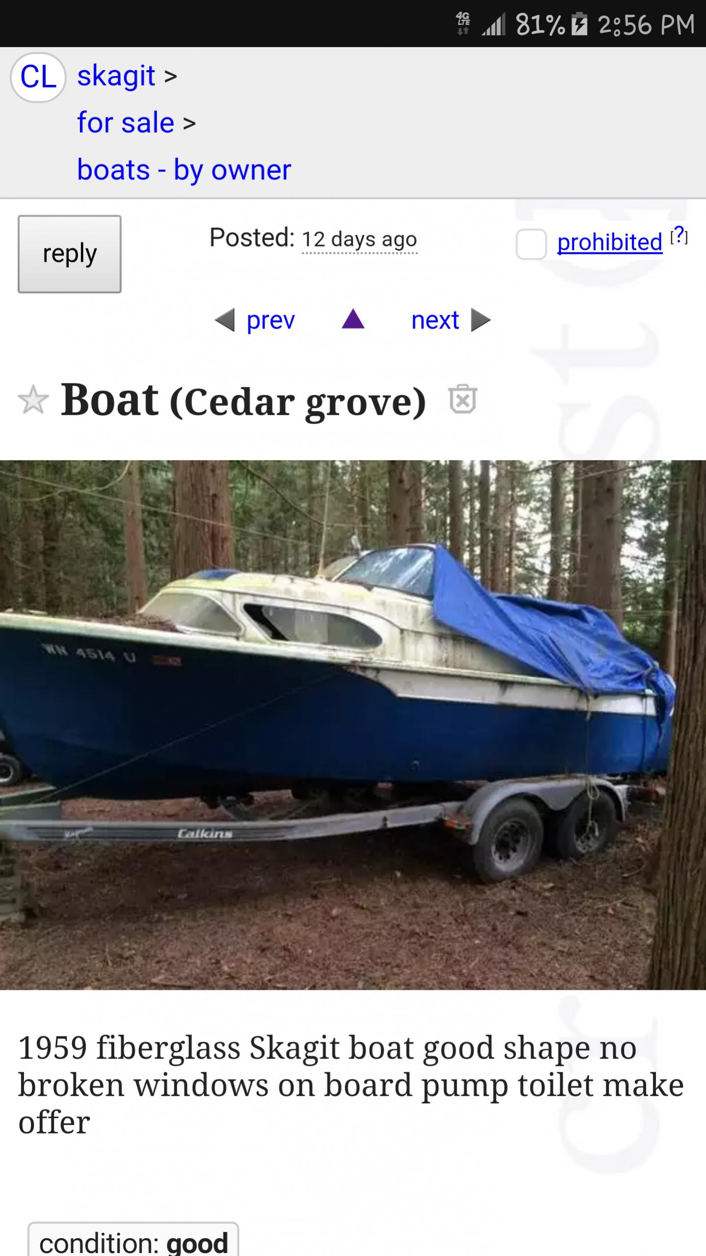 I have one week to figure out how to get a trailer ready, or borrow a trailer to pick it up. I'm going to check on the 20' Bell Boy that I found a couple of years ago and see if I can still pick it up and use the trailer for this Skagit. I was going to pick it up for the other Skagit 20' Offshore I thought I had but the guy wouldn't come up with a title.