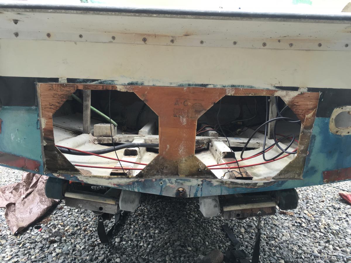 Here are a couple of photos of the existing transom. It had some rot that he has taken out. He is planning on filling the holes and then adding an additional 3/4 ply to the interior side to get the total thickness up to approx 2 inches. His question is, will that be enough support for the merc I/o's? Any suggestions would be great.