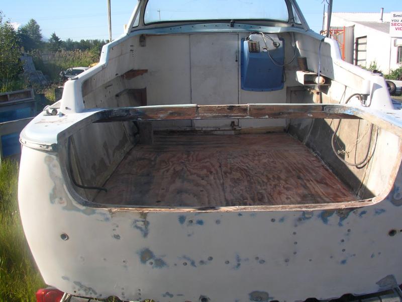 Well the splash well is out and all the fiberglass that was not bonding to the floor is out. A lot of moisture was trapped between the fiberglass and the floor plywood. It was just starting to turn black so I caught it just in time. A little more clean up around the edges and a couple days of this wonderful heat to dry it out and it will be ready for glassing again.