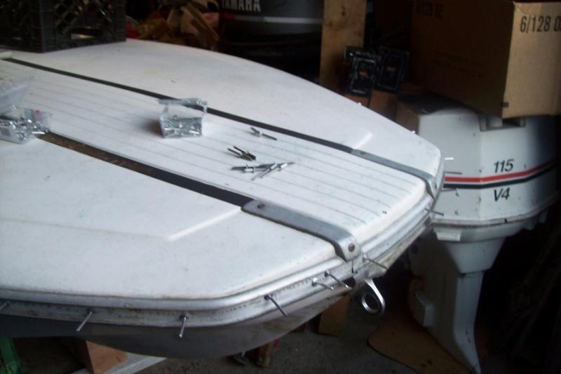 Got the rubrail and top shell now attatched with a full row of new Alum Rivets and SikaFlex 291-LOT.Went down pretty easy but needed a ratchet strap to pull the 2 nd side in place.