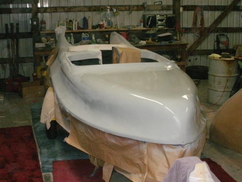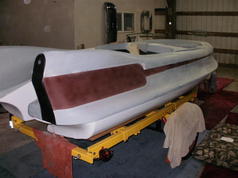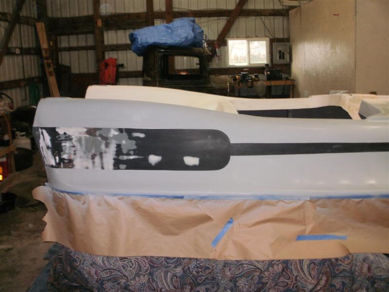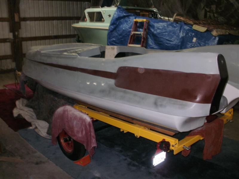 Well got it out to the shop and had a chance to get out to do some sanding and filling on the top side. Put a coat of high build primer on a section and masked off the side stripe. When it dries I'll mask off the out side of the stripe and get some primer on that. Just trying to cover the bare fiberglass and then I'll put a light sand on all of it . Primer makes it alot easier to see any imperfections so I can sand and fill any of those I see. After I'm done with the whole boat will put a final coat of primer on it and then paint. Lots of body work - I have ground out all the spider cracks and filled them and it looks like the end is in site !! Well I go to work tonight and when I hear the horns blowing at Midnight -I know its all over and maybe get back to normal !