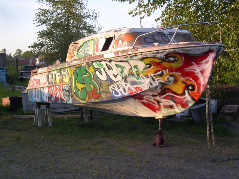 Dorsett Farallon 21 foot. NO TITLE but I have paperwork stating I was allowed to haul it off after it was abandoned at a rental property in Washington. It has a trailer (dual axle), but the trailer is overloaded and one axle is slightly bent. Engine looks like a GM 350 with an OMC outdrive. Condition unknown. Cabin floorplate is rotted through, at least one broken window, and as you can see the local hoodlums in Washington where it was abandoned used it for Graffiti practice. It will need a total paint stripping & refinish.