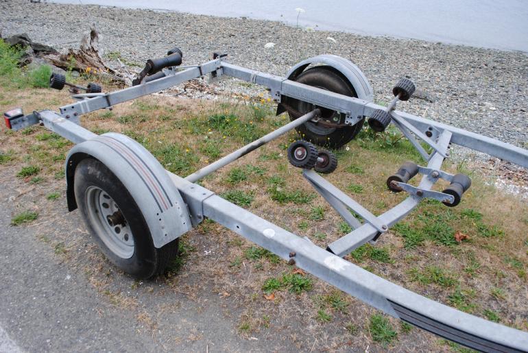 Several weeks ago I purchased a 1969 Larson tri-hull for a nice set of Yamaha outboards with only 97 hours. The boat already went to the transfer station, so the trailer is for sale. The data plate sticker is faded, so the specs are unknown. The boat weighed 1,580 pounds at the dump, plus fuel and two motors; it probably totalled about 2,200 pounds payload. It looks pretty heavy duty. Wheels are 15", total length is 19 feet, distance between fenders is 66," 2 inch tow coupler hitch. The center rollers are rusted to the shafts, but the outer rollers function. Bearing buddies, lights work now, new standard four wire flat plug. The winch and fold up tongue jack work great; better than my other trailer. It's road-able as is.