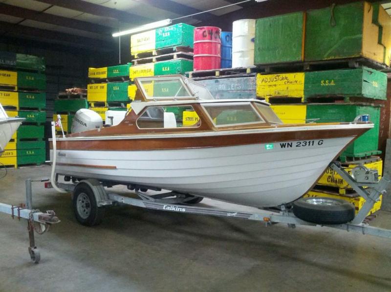From the photos, boat looks amazingly clean and unmolested. Tailer is a newer Caulkins, and a new Honda 50 haning off the back! I am so tempted by this cool little pocket cruiser myself but the divorce would surely be much more expensive.