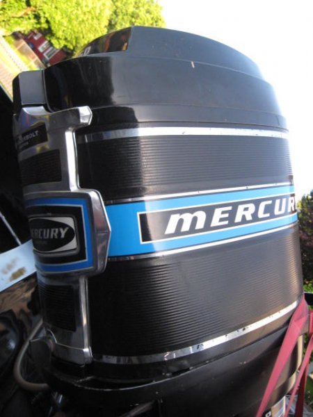 Fiberglass body, 1974 Mercury 115 hp outboard motor.