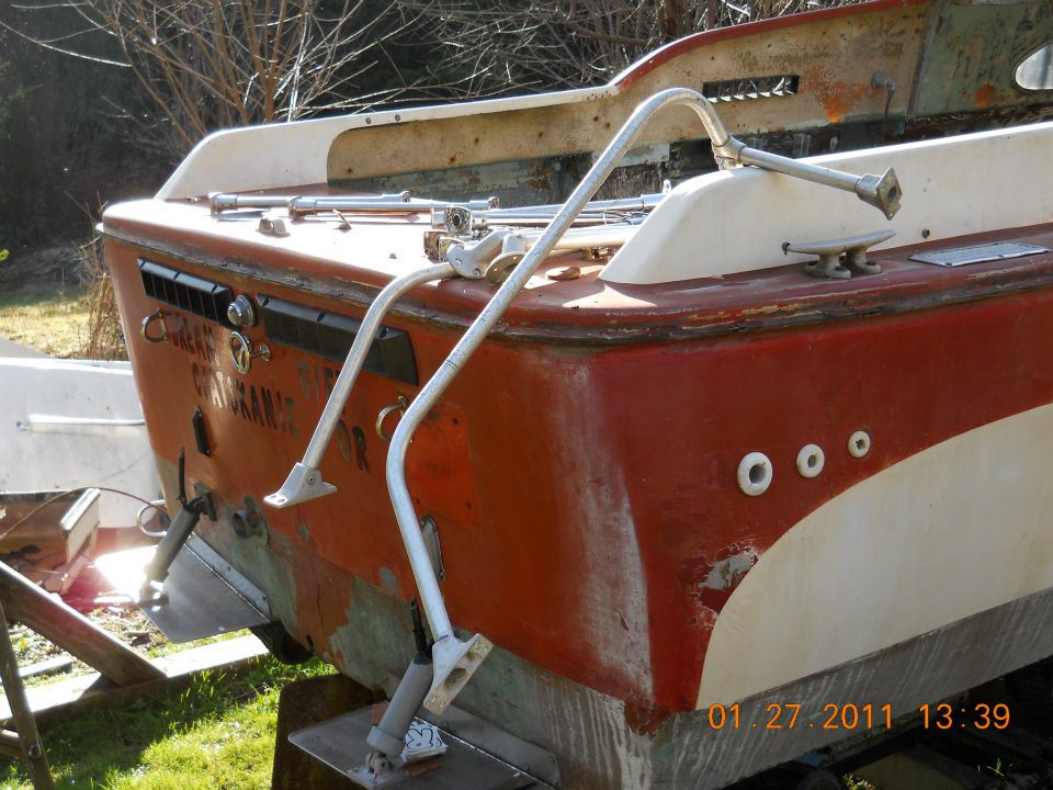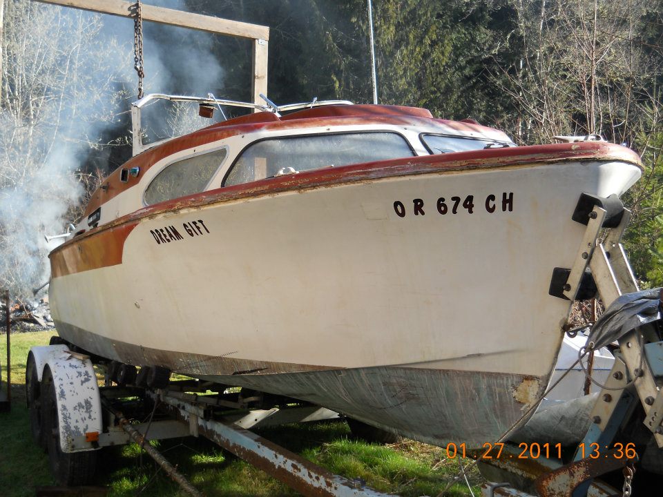 Hi folks. My name is Shaun. I'm here because I have a beautiful old boat I cannot work on, and I am looking a new home for her. She's a 1960 Skagit 21' Express (20' model, licensed as a 21'), sitting on a 1978 EZLoader trailer. To be very honest, she is a bare-hull restoration project. The engine was seized and unrecoverable, the transmission is gone, but prop, shaft, rudder, and steering gear is all there. The trailer is all there, but needs the rollers adjusted to fit this boat. It used to hold a Bayliner Nisqually 2350 Command Bridge, so the size difference is significant.