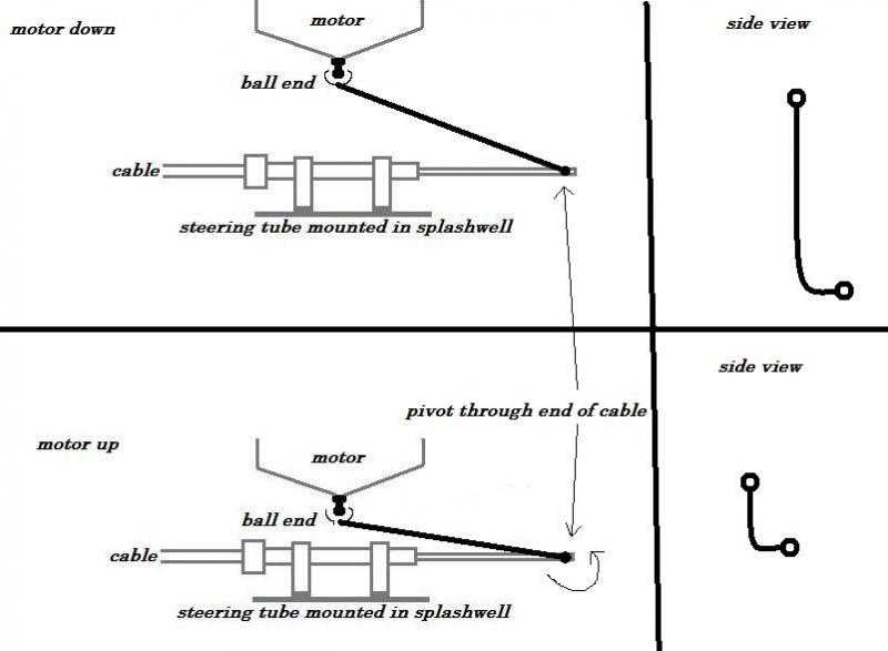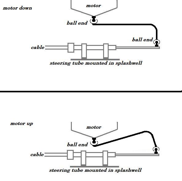 Now that I am not on the centerline of motor pivot, I have a problem of steering rod pivot when the motor is tilted up. The steering rod will have to pivot on both ends. I noticed that there is only one ball end pivot on other steering rods. What would happen if I had a ball end on each end?(drawing)