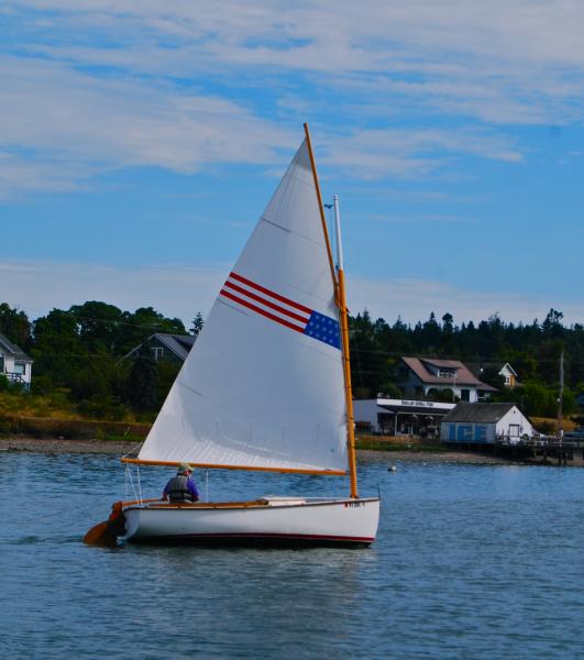 It has a gaff rig, one of my favorites, and a knife-shaped centerboard. It's easy to sail, goes to windward nicely, and can easily accommodate four adults...so it'll be the perfect daysailer for Mystery Bay and adjoining Kilisut Harbor.