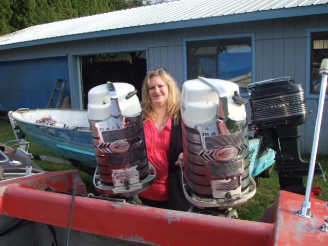 Hey all, thought you might want a peek at my latest creation out in the boat YARD! Traded a NWCBC member some dragboat hardware for this 1958 Crosby Fish and Ski. On the back is a 1959 Mark78A short shaft Direct Reverser. Didn't want the boat and trailer, just the motor. As usual, had to take it all as a package! Got it home (another story for another time) and cleaned her up some. Not a bad boat. Seemed pretty solid with good seating and not all butchered up. Drained about 50 gallons of water out of the forward flotation 'tank' (sure towed nice with that extra hitch weight!) Crack in the windshield really sucks. Found a key in another controller that actually fit! WD-40'd everthing and with a fresh battery gave it a whirl. Weak spark. Pulled the cap and found a rotor that someone tried to pry off and broke. Dug thru my parts and found a decent one. put it on, cranked it over and BAMM!, she runs!! After messing with the solinoids some, actually was able to start it backwards (gotta love these crazy engines). Now I am happy to have a runner, but something was missing. Just another old boat is cool, but this one needed something to make it unique. I took a look around in the shed and came up with a plan. I'm alot happier with the boat now that I made a little modification. Cheryl is not quite as stoked as I am to get this one wet (not sure why).