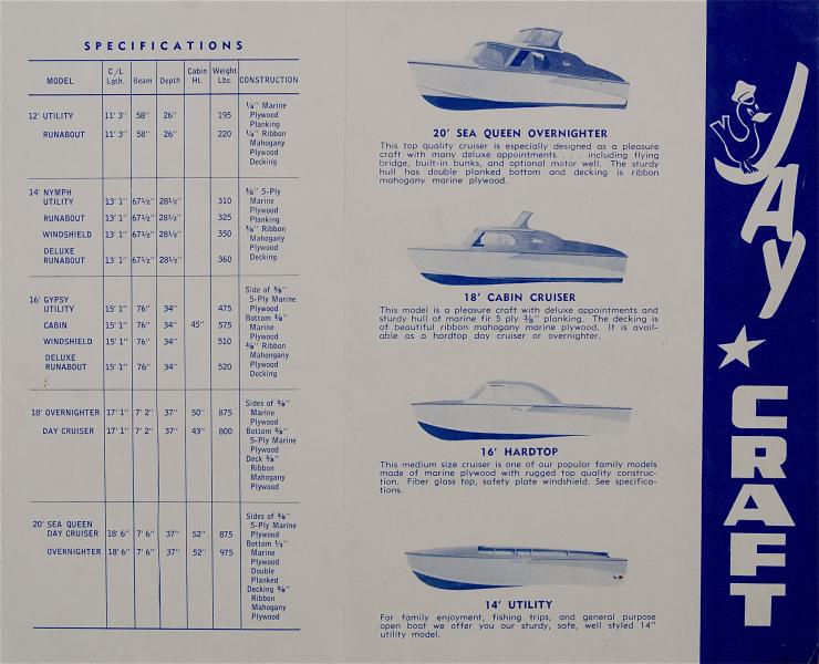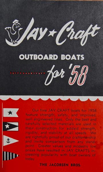 The brothers--Vern, Marv and Arnold Jacobsen--produced a wide variety of wooden boats including some that were carvel-planked, lapstrake and later plywood construction. By the 1950's, if not earlier, they came up with the brand name Jay Craft to describe their standard line of boats.