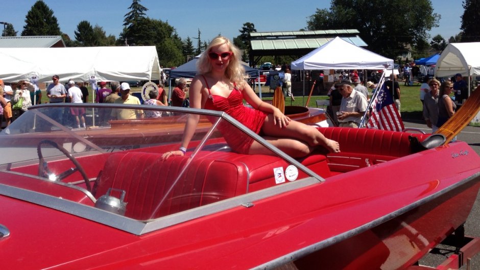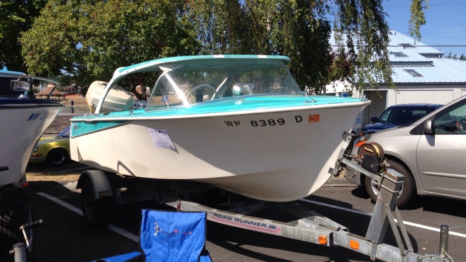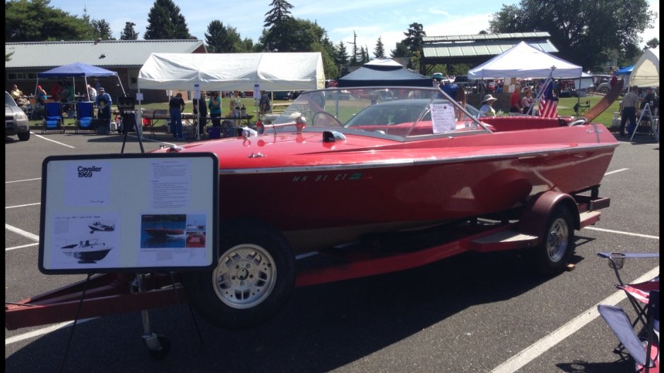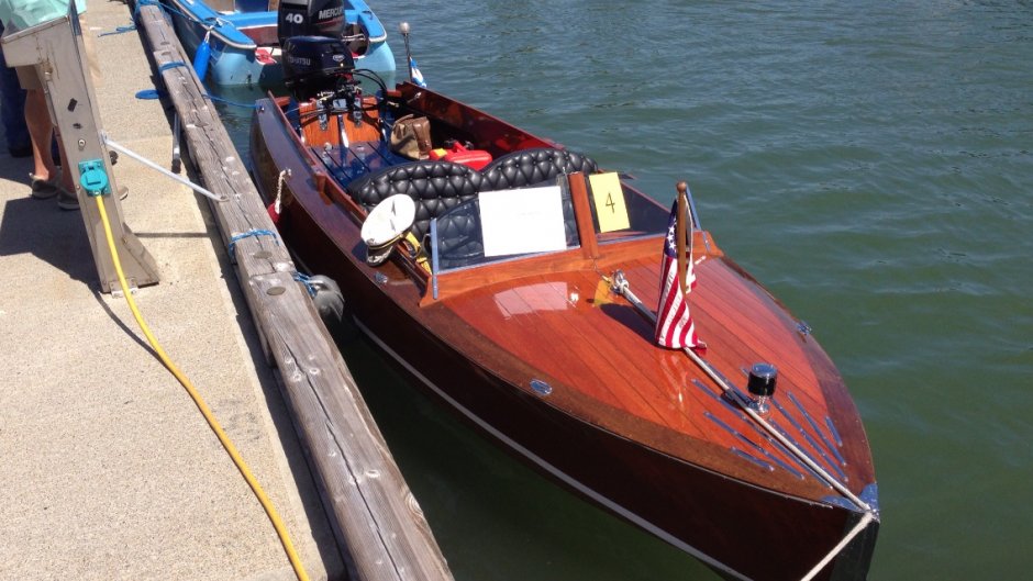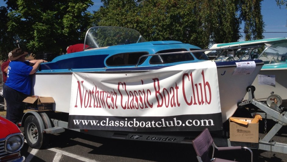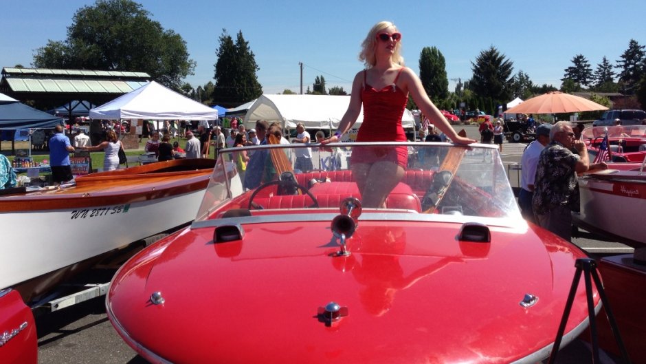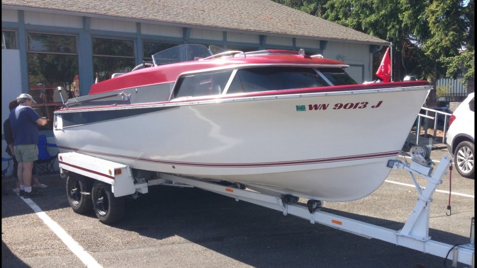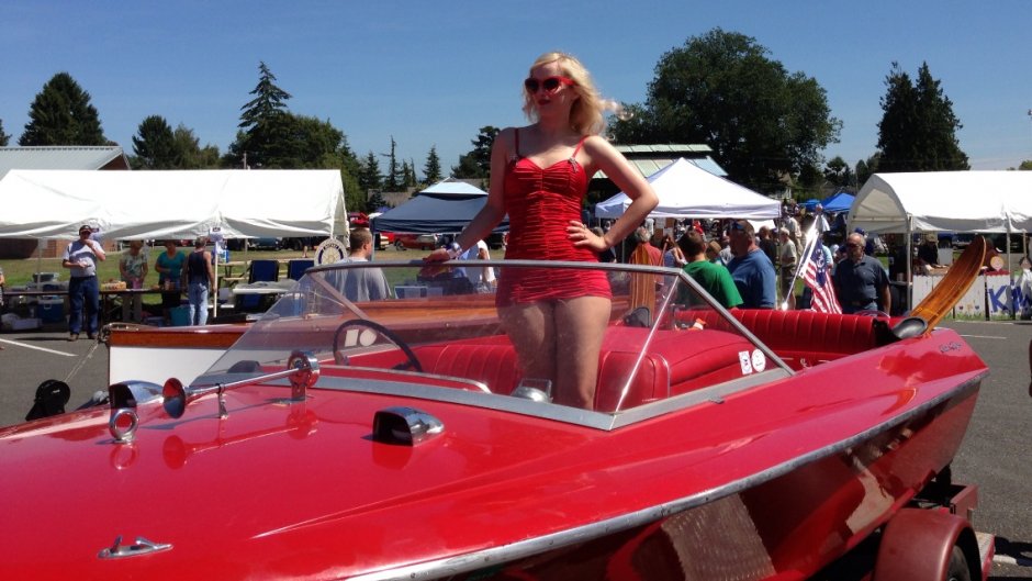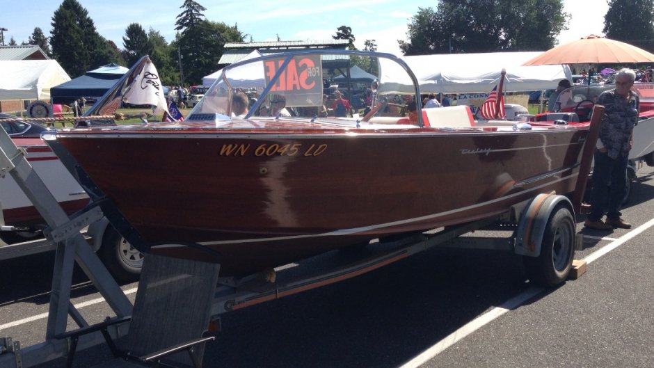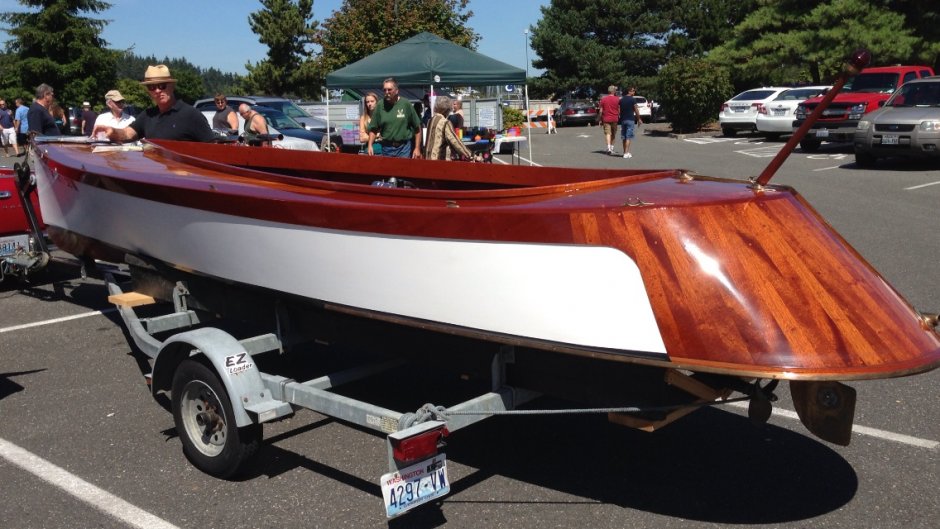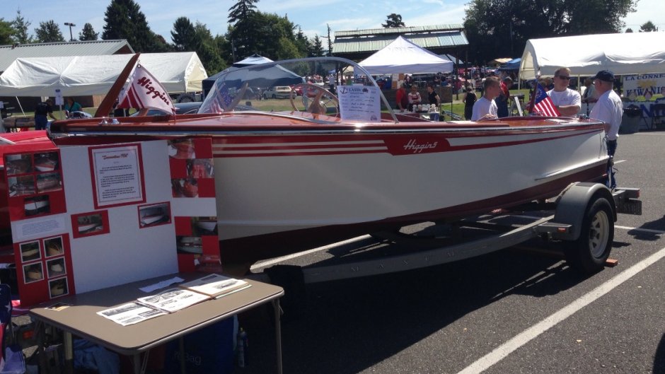 People's choice honors for trailered fiberglass went to Chuck Carey and his freshly restored 1959 Skagit 20 express. The wood trailered boat honors went to a beautiful Higgins speedster.