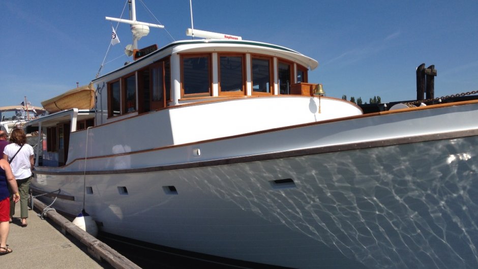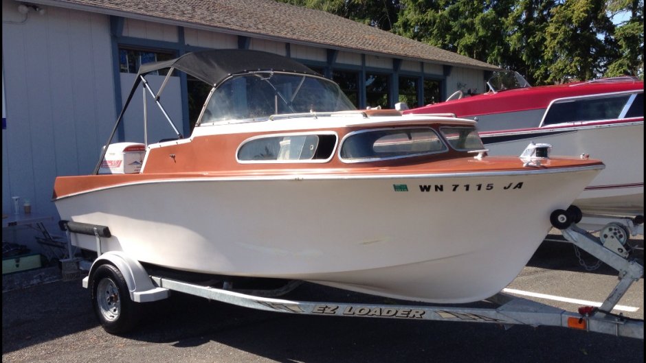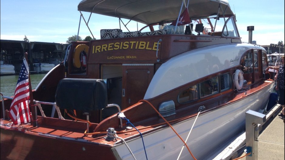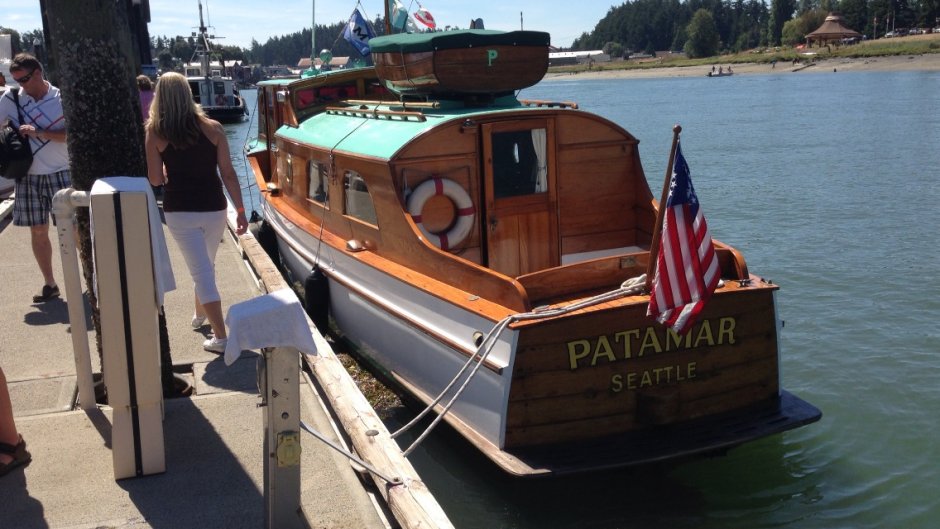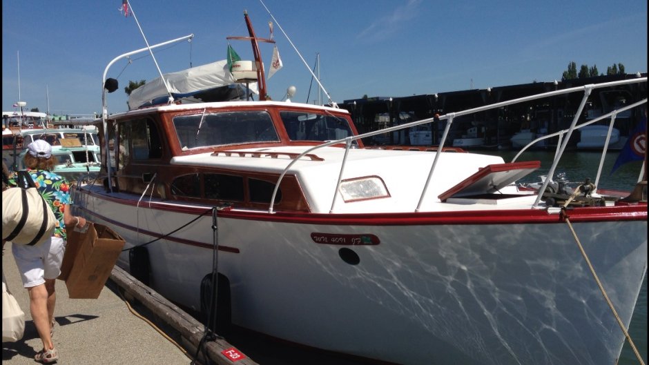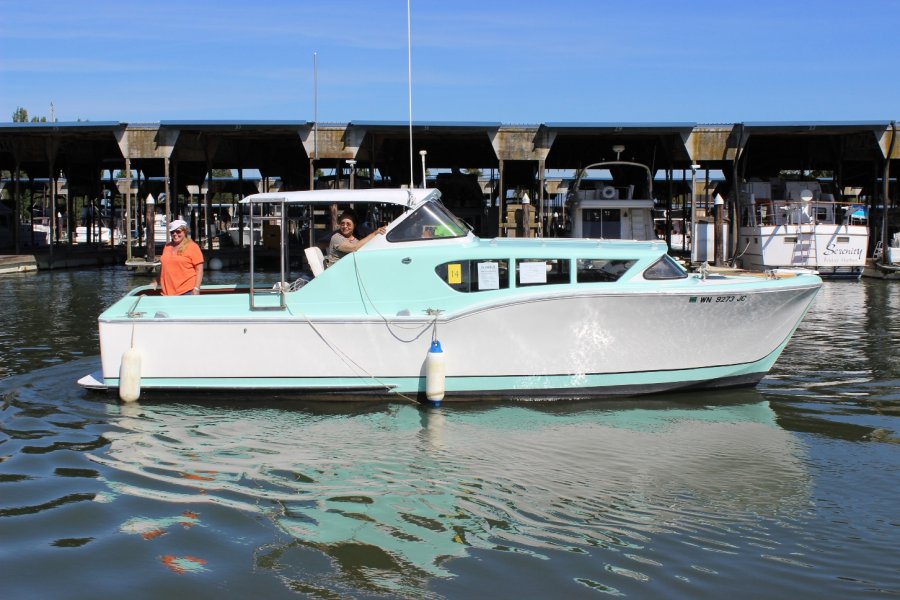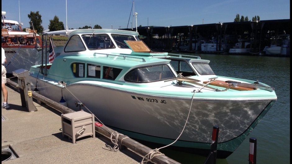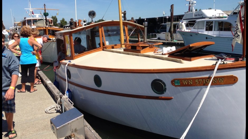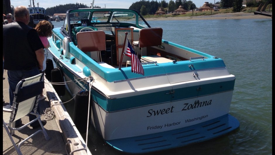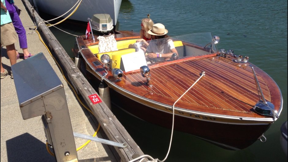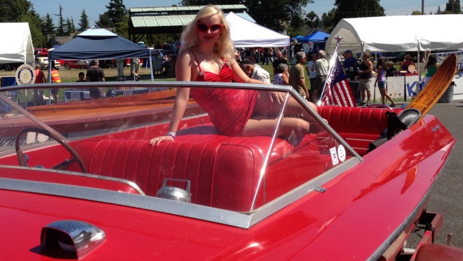 People's choice honors for trailered fiberglass went to Chuck Carey and his freshly restored 1959 Skagit 20 express. The wood trailered boat honors went to a beautiful Higgins speedster.