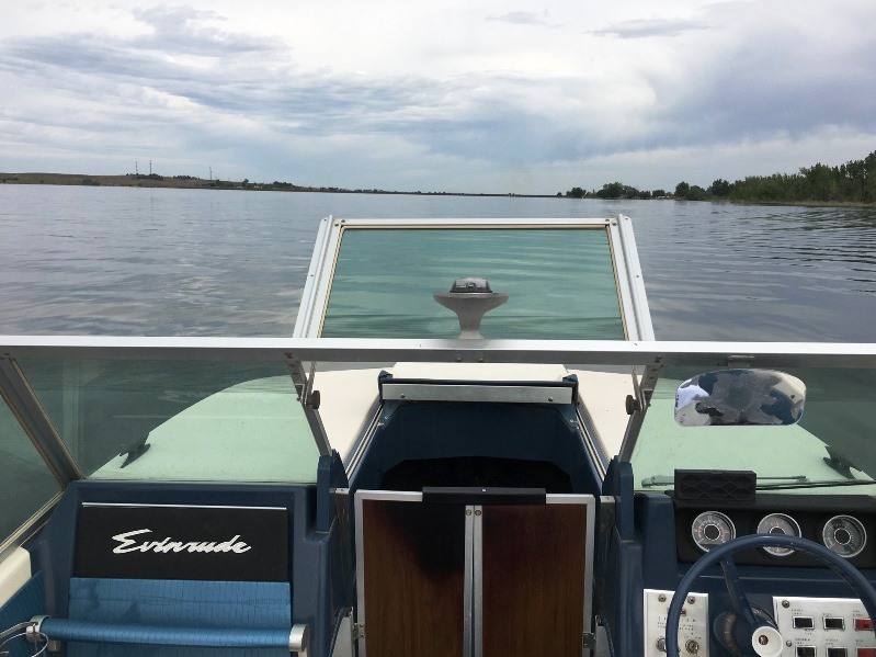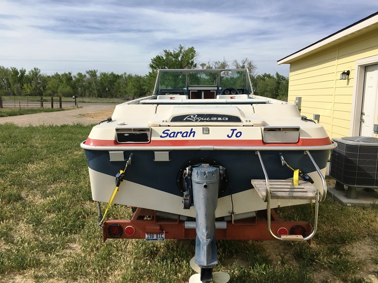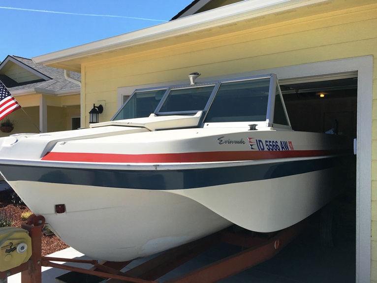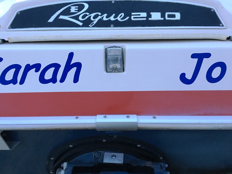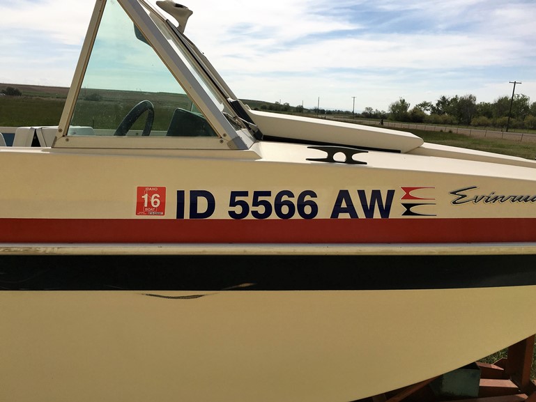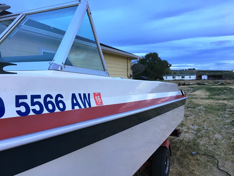 One final stop at Idaho Watersports to get the new hull numbers and the name cut and then I went home. The hull got a good cleaning with Attwood Hull Cleaner, and then I attached the new Evinrude emblems I got from Andrew Gleason, the hull numbers and the name.