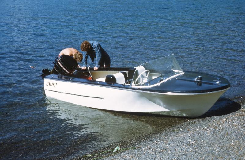 Here's a picture of "Itchin" before the name was painted on the side. The red boat is a 13.5'. Dad hated the Johnson (look how long the shaft is LOL) and put on a 1959 Evinrude 35HP.... he could not afford a Merc at the time....9 kids to feed. That's me in the hat